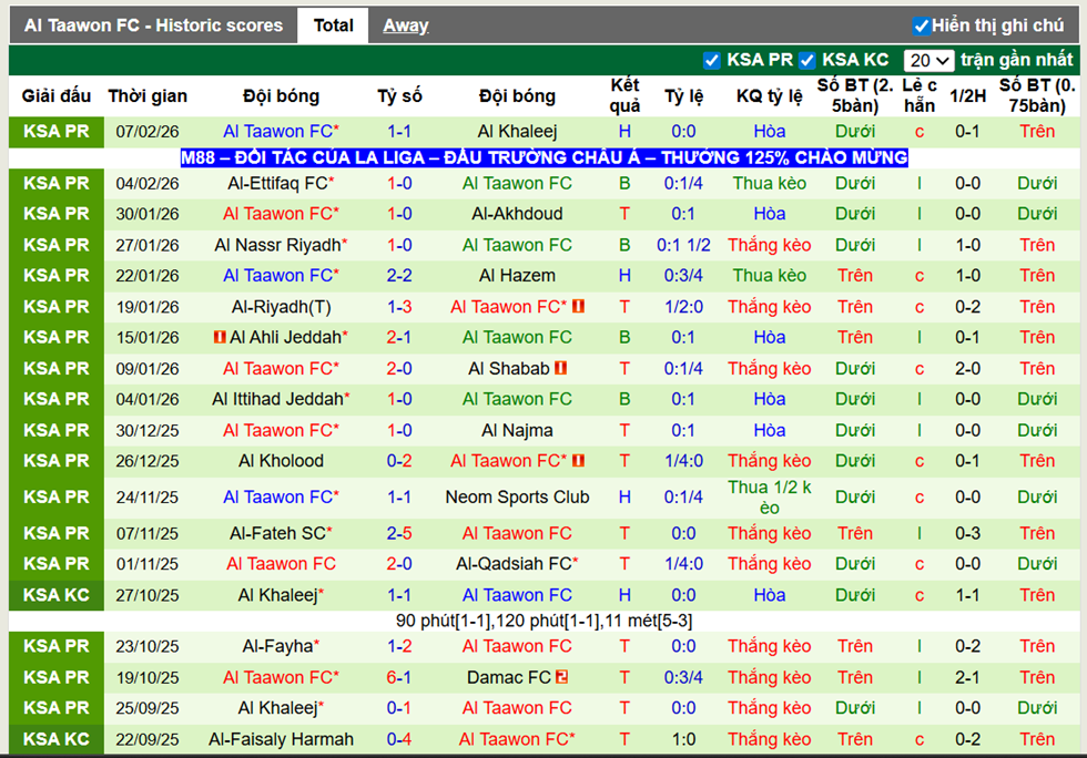 Chưa lấy lại được phong độ tốt nhất và phải hành quân xa nhà thế nhưng ở thời điểm này, Al Taawon FC vẫn phải được đánh giá trội hơn khá nhiều so với Damac FC. Tỷ lệ chấp được niêm yết là 0.5 bàn nghiêng về phía các cầu thủ khách. 10 lần gặp nhau trong quá khứ, Al Taawon FC bất bại trước Damac FC, thắng 5 trận và họ đủ khả năng để giành thêm 3 điểm trên sân của đối thủ này.